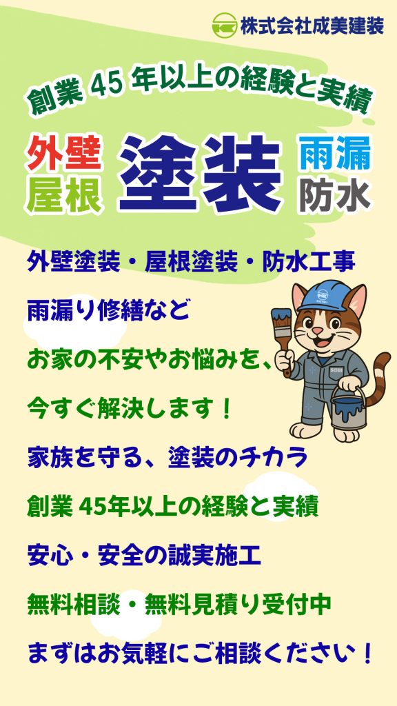 外壁塗装、屋根塗装、防水、雨漏りのご相談・お見積りは、成美建装(セイビケンソウ)まで